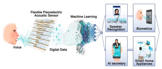 In addition, as illustrated in Figure 5, Jung et al. reported a flexible piezoelectric acoustic sensor and machine learning for speech processing. Flexible piezoelectric acoustic sensors vibrate in response to the speaker’s voice to store electrical impulses, providing information for preprocessing. To train data and extract linguistic information from voices, use machine learning-based models. The transition of electronic systems from touch to voice operation will be assisted by this technique. They assert that new user interfaces for utilizing artificial intelligence (AI) services will be created by speech recognition systems built on cutting-edge sound sensors and optimized machine learning algorithms [12].