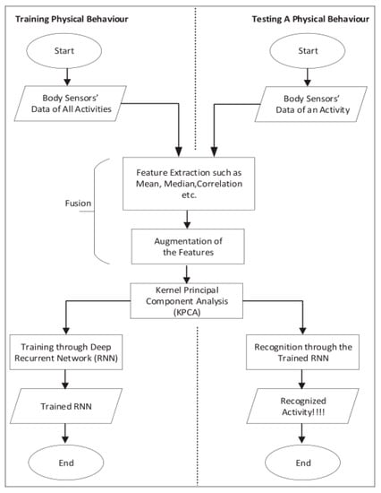 Body sensors have drawn a lot of interest from scientists lately because of their useful uses in the area of smart medicine. Body sensors are now widely used in a variety of real-world settings, including entertainment, security, health, and healthcare. The ability of body sensors to protect and enhance people’s healthy lifestyles is a significant benefit of employing them to monitor individuals. Body sensor-based human motion detection yields insightful information about a person’s functioning and way of life. Figure 7 illustrates Uddin’s proposed body sensor-based behavior identification system, in which a person wears various body sensors on various body areas, including the wrist, ankle, and chest. Sensor data is acquired via wireless media and saved to a computer. The basic flow of the system is shown in Figure 8, which has two basic steps: training and testing [26].