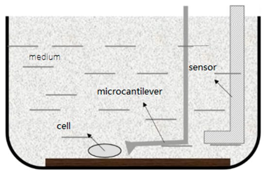One of the MEMS components that is frequently utilized is the microcantilever sensor. Sensors based on microcantilevers have been employed in every part of life since Binning et al. created an improved atomic force microscope through a cantilever in 1986. Researchers now have a deeper knowledge of the microcantilever sensor thanks to extensive theoretical research and application exploration. In order to provide lateral stresses to the cells adhering to the material, Akiko [36], a researcher at the National Institute of Metal Science in Japan, assessed the separation force in the cell culture media, as shown in Figure 9 utilizing optical fiber sensors. A resolution of 0.25 nm and output voltage accuracy of 0.0005 m/mV can be reached when measuring the deviation value of the microcantilever beam, respectively. However, the optical fiber sensing in the liquid has some influence on the entire detecting process. It is difficult and inconvenient to use the equipment.