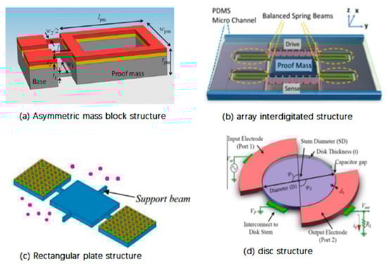In terms of the detection time, sensitivity, safety, in situ sensing, and real-time detection, optical biosensors have several advantages. Its widespread applicability is constrained by the high cost [38]. Electrochemical biosensors are advantageous due to their ability to be made smaller, cheaper, more sensitive, and unaffected by solution turbidity [40]. However, the sensor contains electrolytes, which have a low stability and are significantly impacted by external factors, including temperature, humidity, and pressure. It has some restrictions, because it needs to be calibrated separately for various application situations. Microelectromechanical systems (MEMS) typically use beams [41], discs [42], rings [43], interdigitated fingers [44], and other resonant structures to provide mass-sensitive sensors (as shown in Figure 11). The microbeam structure has the advantages of small size, a simple structure, high sensitivity, easy arraying, and integrationand has become the most potential device in the field of the simultaneous detection of multiple markers [45].