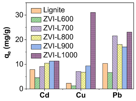 As shown in Figure S5, both lignite and ZVI-L1000 were used to test the simultaneous removal of Cu2+, Pb2+ and Cd2+ from aqueous solutions. The ZVI-L1000 showed adsorption selectivity in the following order: Pb2+ > Cd2+ > Cu2+ at pH 5 (400 ppm metal ion concentration, 0.5 g adsorbent dose, 25 °C, 15 min). A similar result has been observed in previous studies as well. Greater adsorption capacities were observed for Pb2+, Cd2+ and Cu2+ from mono-metal systems (42.5, 55.2, and 38.3 mg/g, respectively) (Figure S5). Comparatively, in multi-metal systems, the adsorption of each metal was greatly suppressed, with Pb2+ = 5.5 mg/g, Cd2+ = 2.4 mg/g and Cu2+ = 0.9 mg/g at pH 5 (400 ppm metal ion, 0.5 g adsorbent dose, 25 °C, 15 min) (Figure S4). This indicates that antagonism is the major competitive effect mechanism here [47]. In this case, all three metal ions compete for a limited number of active sites, decreasing the adsorption. ZVI-L1000 shows a higher Pb2+ selectivity due to its lower hydration energy.