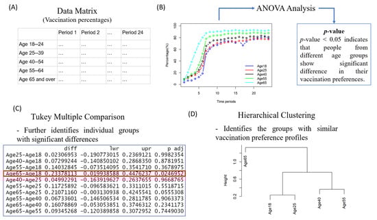 An overview of the statistical analysis approach implemented in each sociodemographic category: (A) data extracted and translated into a percentage data matrix for the category (e.g., ages); (B) the ANOVA of the data matrix to indicate whether a significant difference in vaccination preference was detected in different groups in the category; (C) Tukey multiple comparisons of paired groups in the category to identify those pairs of groups showing significant differences in their vaccination preference; (D) hierarchical clustering to illustrate the similarities shown in vaccination preference profiles of different groups in the category.