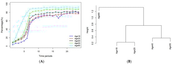 (A) The historical profiles of vaccination percentages for different age groups; (B) the hierarchical clustering results for different age groups based on their vaccination rates over the sampling periods. One sampling period generally stands for two weeks (started from 6 January 2021). Meaning of legend items: Age18: people at the age of 18 to 24; Age25: people aged 25–39; Age40: people aged 40 to 54; Age55: people aged 55 to 64; Age65: people aged 65 or higher.