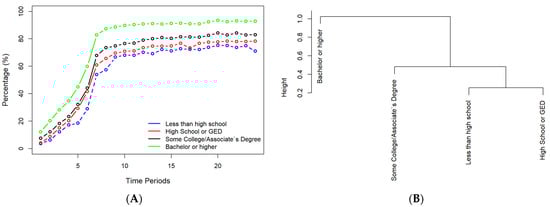 (A) The historical profiles of vaccination percentages for groups with different education levels. (B) The hierarchical clustering result for groups with different education levels based on their vaccination rates over sampling periods.