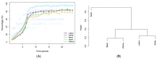 (A) The historical profiles of vaccination for different racial groups. (B) The hierarchical clustering results for different racial groups based on their vaccination data. Latino: Hispanic or Latino; White: White alone, not Hispanic; Black: Black alone, not Hispanic; Asian: Asian alone, not Hispanic; Others: two or more races + other races, not Hispanic.