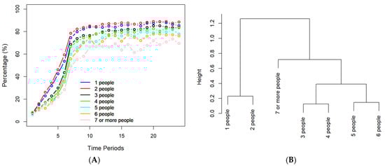 (A) Historical vaccination profiles by household size, (B) hierarchical clustering of different household sizes by historical vaccination data.