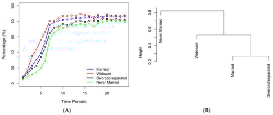 (A) Historical vaccination data for participants with various marital statuses. (B) The dendrogram obtained through hierarchical clustering for groups with different marital statuses.
