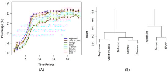 Figure 7A illustrates that all resources increased exponentially until the 6th and 7th time periods. After the 7th period, the ‘RegIncome’, ‘credit or loans’, and ‘savings’ groups maintained a relatively consistent pattern, while the others showed significant fluctuations. Of all the datasets, the resources from the regular income remained the greatest until period 14, where ‘credit or loans’ surpassed this group. The resources from ‘SNAP’, however, consistently had the lowest percentage. Moreover, the p-value from the ANOVA was 0.27 (p > 0.05), which indicated that the eight groups with different income resources did not have significant statistical differences in vaccination preference. This result was reflected in the Tukey multiple comparisons test, where the returned p-values were all above 0.05. Furthermore, the hierarchical clustering in Figure 7B demonstrated similarities between participants with a ‘regular income’ and ‘credit or loans’, between ‘savings’ and ‘stimulus’, and between ‘borrowing’ and ‘SNAP’. The less similar groups, such as ‘regular income’ versus ‘SNAP’, are located in separate branches in Figure 7B.