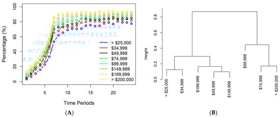 (A) The historical profiles of vaccination for participants with different household incomes. (B) A dendrogram obtained through hierarchical clustering for participants with different household incomes.