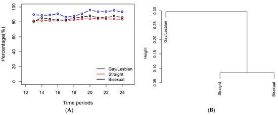 Similar to the factor ‘gender’, the data for ‘sexual orientation’ were only sampled in the last 12 periods. This category included three options: “gay/lesbian”, “straight”, and “bisexual”. The p-value returned from the ANOVA was less than 0.001. Since this value was lower than 0.05, the sexual orientation had a significant impact on the participants’ vaccination attitudes. As seen in Figure 10A, the vaccination rates of the straight group always fluctuated below those of the bisexual and gay/lesbian groups. The gay/lesbian group surpassed all other groups when it came to vaccination rates. The Tukey multiple comparisons test further strengthened this conclusion by showing that the gay/lesbian groups had a similarity p-value of less than 0.05 with either the straight group or the bisexual group. This trend was also reflected in the hierarchical clustering diagram (Figure 10B), in which the gay/lesbian group had less similarity with the straight and bisexual groups.