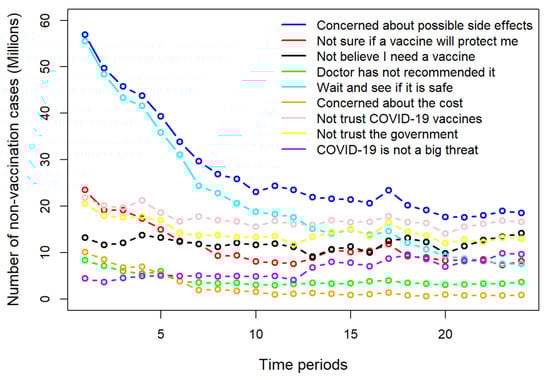The following nine reasons were surveyed in all 24 datasets: (1) concerned about possible side effects; (2) do not know if a vaccine will protect me; (3) do not believe I need a vaccine; (4) doctor has not recommended it; (5) plan to wait and see if it is safe; (6) concerned about the cost; (7) do not trust COVID-19 vaccines; (8) do not trust the government; (9) do not think COVID-19 is a big threat. The numbers of people not receiving or planning to receive vaccines due to each of these reasons are shown in Figure 11. It can be seen that concerns regarding the side effects (reason 1, the blue curve) and vaccine safety (reason 5, the cyan curve) were the two dominant reasons for people not taking vaccines at the beginning of the pandemic. It can be recognized that the number of people not taking vaccines due to these two reasons generally decreased over time. “COVID-19 is not a big threat” seemed to show a slight gradual increase throughout the time periods. “Do not trust COVID-19 vaccines” and “do not trust the government” generally had the highest numbers of non-vaccination cases besides the two dominant factors. “Doctor has not recommended it” and “concerned about the cost”, on the other hand, were the reasons that had generally the lowest numbers of non-vaccination cases.