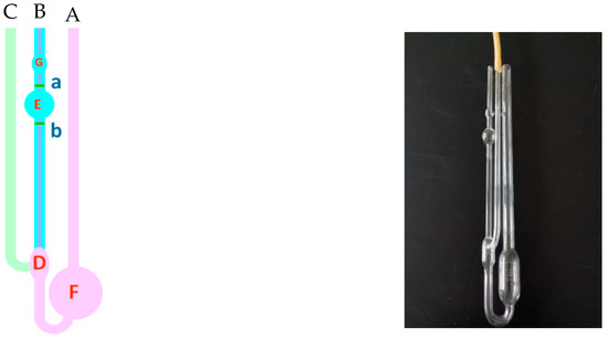Ubbelohde viscometer. A—Air suspension pipe; B—Measuring capillary; C—Liquid injection pipe; D—Round pipe; E—Quantitative sphere; F—Liquid ball; G—Buffer ball; a—Upper score line; b—Lower score.