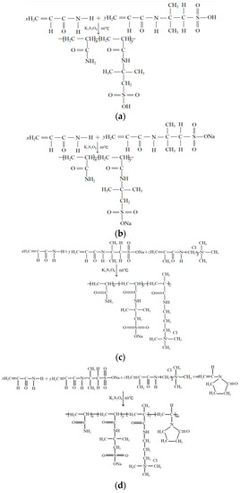 - NaAMPS is used in the synthesis of GTY−1 and GTY−2. Amps and NaAMPS are often used in the synthesis of high molecular polymers. The thickener was synthesized with both as raw materials. The results are shown in Figure 6a,b. It can be seen from the figure that the rheological properties of the No. 1 and No. 2 polymers have little difference. At 120 °C, 100 s−1, the viscosity is 54.69 mPa·s and 66.89 mPa·s, respectively; at 180 °C, 100 s−1, the viscosity is 8.11 mPa·s and 8.65 mPa·s, respectively. From the figure, it can be seen that at 120 °C, 100 s−1, the viscosity of the No. 1 and No. 2 polymers is 54.69 mPa·s and 66.89 mPa·s, respectively, and at 180 °C, 100 s−1, the viscosity is 8.11 mPa·s and 8.65 mPa·s, respectively. It can be seen that the rheological properties of polymers 1 and 2 are similar, and amps and NaAMPS as reaction raw materials have little effect on the properties of polymers. However, from the rheological comparison results of No. 4 and No. 6, the viscosities of the No. 4 and No. 6 polymers at 120 °C and 100 s−1 are 197 mPa·s and 258 mPa·s, respectively, and the viscosity of the No. 6 polymer is significantly higher than that of No. 4. The variables of the two are only amps and NaAMPS, but they are inconsistent with the results of No. 1 and No. 2, which is caused by the difference in molecular weight. The reason for the difference in molecular weight is the concentration. The reaction environment requires pH = 6, while amps is a strong acid, which needs to be adjusted by a certain amount of 40% NaOH solution, which will have a great impact on the material concentration in the solution.