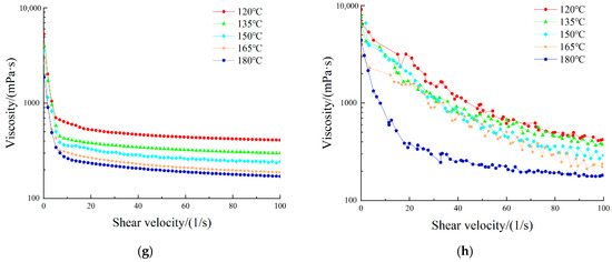 In order to investigate the temperature resistance of the synthetic polymer, the rheology in the temperature range of 120~180 °C was studied. The experimental results are shown in Figure 6.