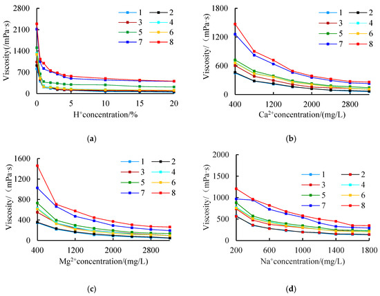 Acid- and salt-resistance stability of polymer. (a) Acid resistance stability; (b) VCa2+ stability; (c) Mg2+ stability; (d) Na+ stability.