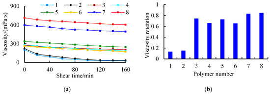 It can be seen from Figure 6 and Figure 8 that the viscosity of the polymer decreases with the increase of shear speed and drunk shear time, and the reduction range is different. Figure 8 declares that the viscosity of the No. 1 and No. 2 polymers decreased most obviously, and the viscosity retention (the ratio of viscosity after shear to initial viscosity) was 13.35% and 15.35%, respectively, and the viscosity decreased significantly at the initial stage of mixing. This is because the influence of shear rate and shear time on a polymer aqueous solution is mainly reflected in the change of the physical crosslinking network of the polymer molecular chain caused by mechanical movements such as stirring and shear [15], which destroys the network structure between molecules and reduces the viscosity.