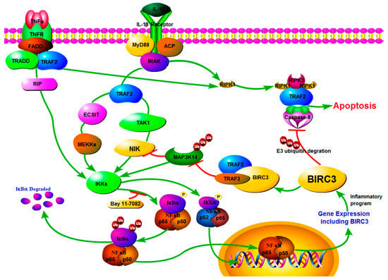 - Zarnegar, B.J.; Wang, Y.; Mahoney, D.J.; Dempsey, P.W.; Cheung, H.H.; He, J.; Shiba, T.; Yang, X.; Yeh, W.C.; Mak, T.W.; et al. Noncanonical NF-κB activation requires coordinated assembly of a regulatory complex of the adaptors cIAP1, cIAP2, TRAF2 and TRAF3 and the kinase NIK. Nat. Immunol. 2008, 9, 1371–1378. [Google Scholar] [CrossRef]
