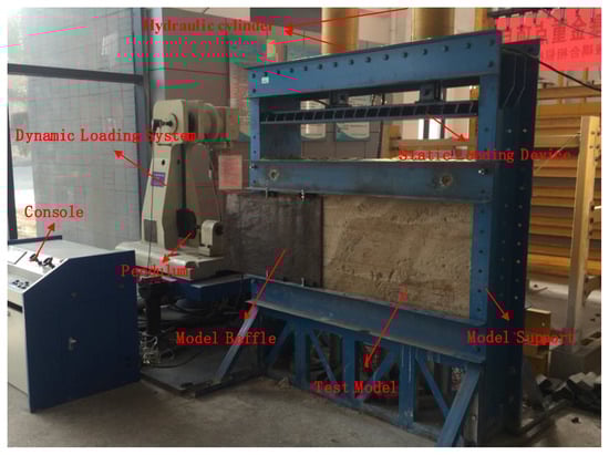 As shown in Figure 2, the test device is divided into four parts: 1. Control table; 2. Dynamic loading device (pendulum); 3. Static loading device (hydraulic cylinder); 4. Model framework. The model frame size is 1.6 m × 0.4 m × 1.2 m (length × width × height). The control table can adjust the pendulum to different heights, control the static load stress, and loading and unloading. The dynamic loading device uses a pendulum to swing to different heights and angles and then freely drop and knock to transfer the rod to form the dynamic load energy, and passes the rod to the plate embedded in the model. The dynamic load is applied to the set position, and the dynamic load propagates in the model in the form of vibration waves and causes coal rock vibration. The static loading device is mainly controlled by the hydraulic cylinder. Two hydraulics are linked to the loading plate that is not on the model. When the loading plate contacts the model, the hydraulic cylinder pressure rises to the preset static loading stress, which is uniformly applied to the upper part of the model, so as to simulate the self-weight stress of coal rock on the upper part of the model.