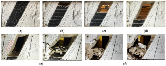 Model excavation process and phenomenon. (a) Not excavated; (b) Tier 1; (c) Tier 3; (d) Tier 5; (e) Tier 6 and Dynamic load applied to the 6th layer; (f) Tier 7 and Dynamic load applied to the 7th layer.