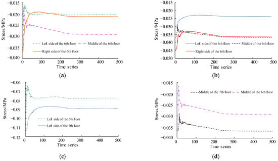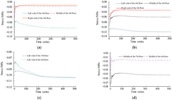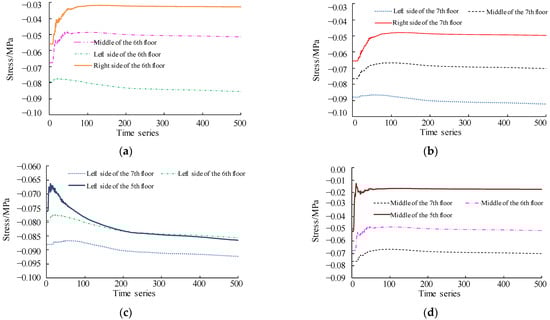 From Figure 8a,b, it can be seen that the stress state of the left, middle, and right sides of the same horizontal coal seam floor are not the same; the stress on the left side of the coal seam floor is the largest, followed by the middle of the floor, and the stress on the right side of the floor is at the lowest state. After the excavation of the fifth stratum, the stress in the middle of the bottom plate of the sixth stratum decreases rapidly from −0.068 to −0.05 MPa, and then gradually stabilizes; the stress on the right side of the bottom plate decreases rapidly from −0.056 to −0.033 MPa, and the trend is the same as that in the middle; while the stress on the left side of the bottom plate decreases first from −0.08 to −0.077 MPa and then rises slowly to −0.083 MPa, and finally stabilizes gradually; and unlike the middle and right sides, the stress on the left side of the bottom plate increases rather than decreases. After the coal seam was mined, the top plate did not collapse but the extent of the mining void increased, and the overhanging area of the top plate on the left side was larger; thus, the bending moment was larger. This makes the stress concentration more obvious on the left side of the top plate below, while the central and right side of the bottom plate area also decreases its stress concentration due to the increase in gravity parting moment and the transfer of force. The stress distribution and trend of the bottom plate of the seventh stratum are the same as those of the bottom plate of the sixth stratum, with an increase in the stress on the left side and a decrease in the stress on the middle and right side. From Figure 8c,d, it can be seen that on the same side of the coal seam floor, the stress increases with the increase in mining depth. The magnitude of stress change at the bottom of the fifth stratified coal seam is greater, and the rate of stress rise is faster, so the closer the distance to the mining area, the more obvious the stress change in the coal body below it.