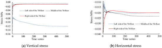 Analysis of Figure 9, Figure 10 and Figure 11 shows that: the vertical stress in the coal seam floor is similar to the stress distribution and change trend in Figure 8, while the horizontal stress and vertical stress distribution are not the same. After the sixth stratum was mined, the horizontal stress on the left side of the coal seam floor was relatively small, and the stress on the left side of the bottom of the sixth stratum first decreased and then increased, from −0.025 to −0.016 MPa and then increased to −0.020 MPa and then stabilized; the stress on the left side of the base plate of sublevel 7 then decreases from −0.031 to −0.023 MPa and then gradually stabilizes. The trend of stress changes in the middle and the right side is similar, both decrease first and then increase, and finally, the stress decreases overall. The stress trend on the right side of the 6-layer bottom slab is the largest, with a stress drop of about 0.016 MPa. after the 7th stratification mining, the vertical stress on the left side of the bottom slab first decreases and then increases, and the overall stress is basically the same as before the change after stabilization. In contrast, the vertical stresses in the middle and the right side of the bottom plate decreased rapidly, from −0.06 MPa and −0.03 to −0.01 MPa, respectively, and the vertical stresses in the middle and the right side were almost the same after stabilization. For the horizontal stress, the left, middle, and right-side horizontal stresses are all decreasing before rising, and the stresses are in decreasing state after stabilization, and the stress drops are 0.004 MPa, 0.015 MPa, and 0.018 MPa, respectively, and the right-side horizontal stress decreases and changes the most, while the middle stress is at the highest level after stabilization.