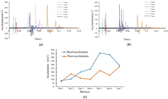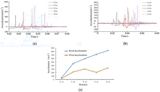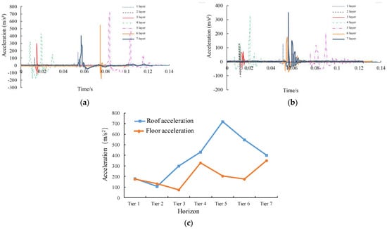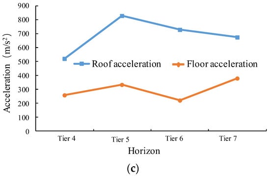 Acceleration response characteristics of each layer when the pendulum height is 0.4 m. (a) Acceleration at the roof of surrounding rock; (b) Acceleration at the floor of the roadway; (c) Peak acceleration at each level.