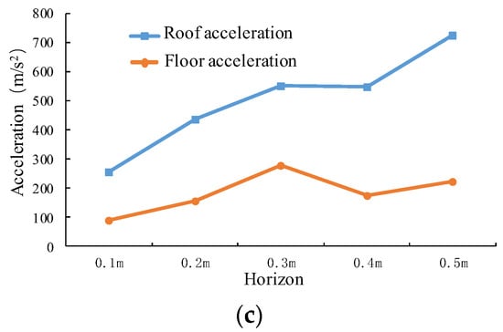 Acceleration response characteristics of each layer when the pendulum height is 0.2 m. (a) Acceleration at the roof of surrounding rock; (b) Acceleration at the floor of the roadway; (c) Peak acceleration at each level.