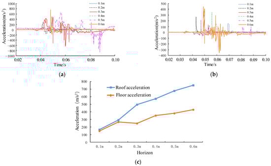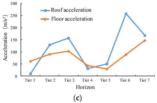 Acceleration response characteristics of each layer when the pendulum height is 0.1 m. (a) Acceleration at the roof of surrounding rock; (b) Acceleration at the floor of the roadway; (c) Peak acceleration at each level.