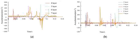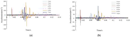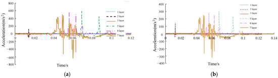 In order to study the relationship between acceleration response characteristics and source propagation distance, the acceleration time history curves of each layer under the same energy condition are compared and analyzed, so as to reveal the influence of propagation distance on the deformation and failure of coal rock. The acceleration response characteristics of each layer under the same dynamic load are shown in Figure 15, Figure 16, Figure 17, Figure 18 and Figure 19.