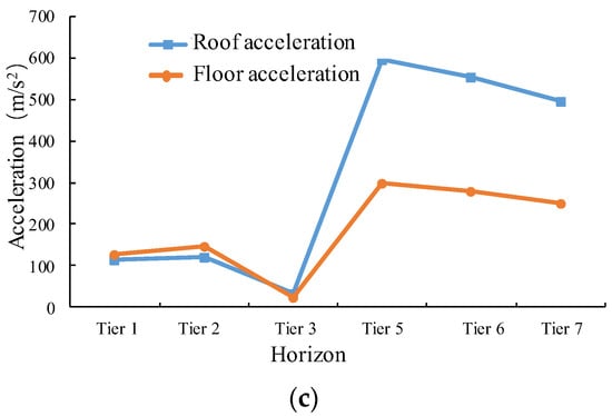 The acceleration of the roadway coal rock under dynamic load is one of the key parameters reflecting the dynamic response of the roadway, and the deformation and damage mode and degree of the roadway coal rock are often related to the peak acceleration. The acceleration response characteristics for different intensity dynamic loads in 5, 6, and 7 strata are shown in Figure 12, Figure 13 and Figure 14.