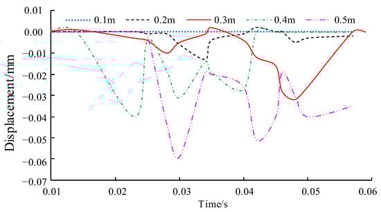 The displacement response characteristics have a certain linear relationship with the acceleration response characteristics, and the change law is similar to that of acceleration. The displacement–deformation characteristics of coal rock under the action of dynamic load were analyzed, but due to the limitation of monitoring equipment, the collection of effective test data was limited, so some displacement data were analyzed to explore the displacement–deformation law of coal rock body after the action of dynamic load. The displacement time curves of stratum 5–7 are shown in Figure 20, Figure 21 and Figure 22, respectively.