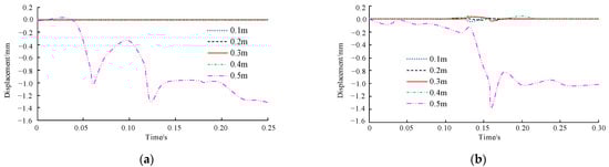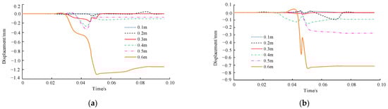 Analysis of Figure 20, Figure 21 and Figure 22 shows that: the fifth stratum only monitors the displacement at the bottom plate of the roadway, the sixth stratum is the test pendulum height of 0.5 m, the top and bottom plate displacement is valid data, and the seventh stratum monitoring data are relatively more complete. In Figure 21, the peak displacements of the bottom plate are 0, 0.013 mm, 0.032 mm, 0.04 mm, and 0.059 mm when the pendulum height is 0.1–0.5 m, respectively, and the displacement deformation increases with the increase in dynamic load energy. In Figure 22b, the pendulum height is 0.1–0.6 m, and the peak displacements of the bottom plate are 0.005 mm, 0.092 mm, 0.021 mm, 0.152 mm, 0.273 mm, and 0.733 mm, respectively, compared with stratum 5, the displacement deformation increases more for the same energy dynamic load, similar to the acceleration response characteristics, and the displacement deformation is also related to the dynamic and static load stresses. Closely related to the mining range, a free space increase to a certain extent will also make the coal rock displacement deformation more obvious.