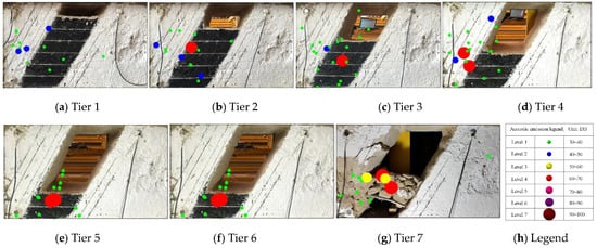 From Figure 23, it can be seen that the acoustic emission events are mostly concentrated in the left plate and the bottom plate of the coal seam. In the 1–4 stratum tests, the dynamic load source is located in the lower left position; in the 6 and 7 stratum tests, the dynamic load source is located in the upper left position, and the acoustic emission positioning results accurately reflect the appearance of coal rock rupture after the dynamic load is applied, and the coupling is good. The first and sixth stratification tests did not show events larger than 60 dB, while all other stratifications did. In the first stratum test, the excavation area was limited and the distance from the source of the dynamic load was far, so the rupture of coal rock caused by the dynamic load was not obvious. In the sixth stratification test, the roof was broken and the coal rock stress was released, so the stress level was low and the rupture caused by dynamic load was less. Regardless of the relative position of the dynamic load source, the large energy events mostly occurred at the location of the bottom plate of the coal seam, indicating that the location of the bottom plate was affected by the mining structure after the stress was higher, and the response characteristics were more obvious after the dynamic load was loaded, and the degree of coal rock rupture was larger and the danger was higher.