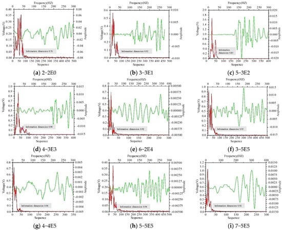 Figure 24a–f show the simulated intensity 100–104 J energy signal waveform and spectrum respectively, and Figure 24g–i shows the signal characteristics above 105 J energy at each stratification test, whereby taking Figure 24f as an example, the 6-2E4 meaning is the 104 J source signal at the sixth stratification pendulum height of 0.2 m. It can be seen from the figure that the signal frequency below 104 J is higher, with a frequency range of 0–100 Hz and with relatively slow decay; the signal main frequency of 104 J and above is more single, with a frequency range of 0–50 Hz; the peak value section of the waveform of large energy signal (above 104 J) has a shorter duration and faster decay.
