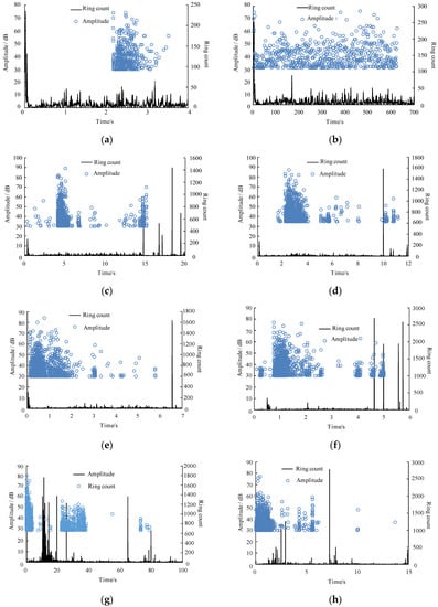 Characteristics of acoustic emission activity parameters. (a) The height of the first layer pendulum is 0.3 m; (b) The height of the first layer pendulum is 0.4 m; (c) The third layer pendulum height is 0.3 m; (d) The third layer pendulum height is 0.5 m; (e) The fifth layer pendulum height is 0.3 m; (f) Fifth layer pendulum height is 0.5 m; (g) The seventh layered pendulum height is 0.4 m; (h) The seventh layered pendulum height is 0.6 m.