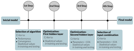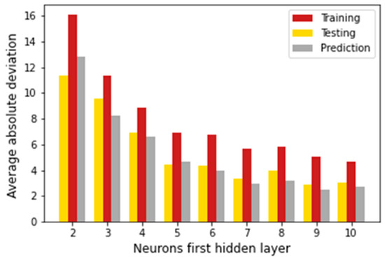 We terminated the iterative process when a maximum of 900 iterations was reached or when consecutive errors of up to 1 × 10−4 were observed. Architectures with two hidden layers were studied, and the optimal number of neurons was determined by trial and error. To avoid overfitting, a limit of up to 10 neurons per hidden layer was considered, and three sets of data were defined: a training set, testing set, and prediction set [42,43]. A multilayer perceptron was built using MATLAB© R2014a software [44] (MATLAB (R2014a)) with code already presented in previous works [45].