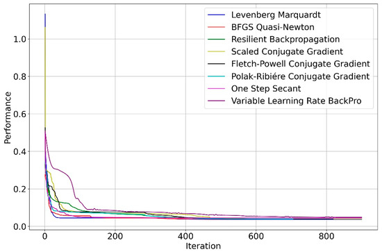From Figure 3, the training step using the LM algorithm converged faster than the other algorithms studied. In Table 3, we can see that the three best performances were obtained with the Levenberg–Marquard, BFGS Quasi-Newton, and Fletch–Powell Conjugate Gradient algorithms, being 0.03645, 0.03873, and 0.03874, respectively.