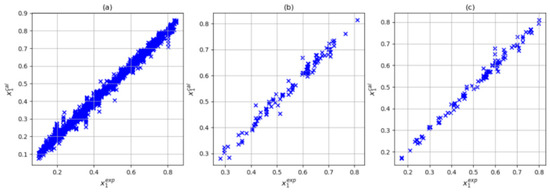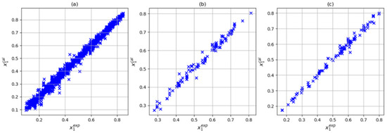 Correlation between experimental data and those calculated by ANN using T, P, Tc, Pc, and ω inputs with (5,6,8,1) architecture: (a) training dataset, (b) testing dataset, and (c) prediction dataset.
