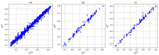 Dispersion of training in three input combination studies with (4,6,8,1) architecture: (a) T, P, Tc, and Pc, (b) T, P, Tc, Pc, and ω, and (c) T, P, Tc, Pc, and Zc.