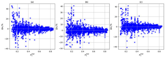 To ensure that the ANN did not predict individual solubilities that are negative or greater than one, the maximum absolute deviation for each run was studied, in addition to determining the average deviations. The individual absolute deviations, average absolute deviations, and average relative deviations of the solubilities calculated with respect to the experimental data are determined using Equations (4)–(6):