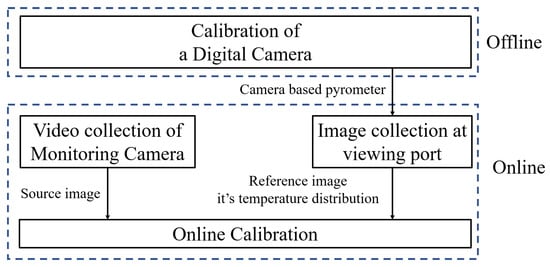 Usually, there will be a viewing port near the video camera for the operator to directly observe the flame. Therefore, as shown in Figure 3b, if flames are shot from the viewing port with the reference camera, it makes sense to assume that the source image has a certain common region with the reference image and the common region represents the same part of flame. Next section introduces the online calibration algorithm to obtain temperature measurement model parameters.