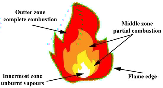 - The innermost zone of flame is the unburnt vapours, this zone is the coldest. The temperature of this zone is relatively consistent at similar combustion condition. According to flame reaction kinetics [25,26], the unburnt vapours temperature range is narrow.
