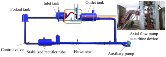 Figure 2 shows the test bench and model device of the axial-flow PAT. The test bench is a vertical closed-loop system. The differential pressure transmitter EJA110A with ±0.18% test error is used for head measurement, which is obtained by measuring the total pressure difference between the two pressure measuring sections of the inlet and outlet of the pump device. The E-mag type DN400 electromagnetic flow meter with ±0.015% test error is used for flow measurement. The ZJ 500 type speed and torque sensor is used for speed and torque measurement, and the test error of ZJ 500 speed and torque sensor in measuring speed and torque is ±0.24% and ±0.05%, respectively. The system uncertainty and random uncertainty of the performance efficiency of the vertical axial-flow PAT test bench were measured and calculated, and the comprehensive uncertainty of the test bench was obtained as ±0.368%. The comprehensive uncertainty of the test bench meets the accuracy requirement of the experiment. The head and efficiency of the axial-flow PAT were measured at the rated speed of 930 rpm for different flow conditions to acquire the performance curve.