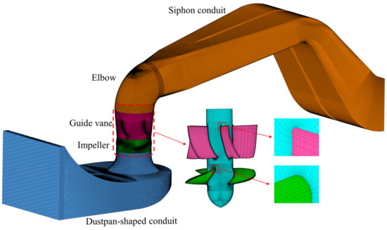 As shown in Figure 1, the object of this study is a vertical axial-flow PAT with a siphon conduit, a dustpan-shaped conduit, an impeller and a guide vane body. UG NX modeling software is used to build a three-dimensional model of the vertical axial-flow PAT. The main parameters are: nominal impeller diameter 300 mm, number of impeller blades 3, number of guide vanes 5, tip clearance 0.2 mm, optimal working flow rate, head, and rated speed 272 L/s, 2.4 m and 930 rpm, respectively. Geometric parameters of the dustpan-shaped conduit and siphon conduit can be found in reference [40].