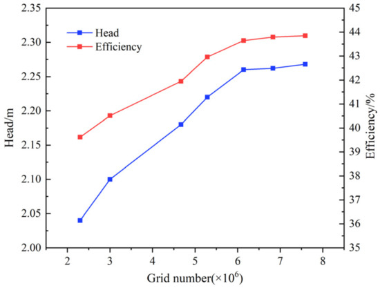 In numerical simulation, it is necessary to verify the independence of the grid number, the purpose of which is to reduce the influence of grid number and size on the calculation results. When the grid is refined to a certain extent, the solution result will not change significantly with the change in the grid number so that the sensitivity of the solution result to the mesh number is reduced. Under the optimal working condition (1.0Qbep), the efficiency and head of pump device with different grid numbers are analyzed for grid number independence. A total of 7 schemes of grids are used to verify the grid number independence, as shown in Figure 4. When the number of grids reaches 6.14 million, the change speed of the pump head and efficiency slows down significantly, and the relative deviation is less than 0.5%, which meets the stability requirements of the calculation. Considering the calculation accuracy and computational resource, the scheme with a total number of grids of about 6.14 million is suitable for this simulation.