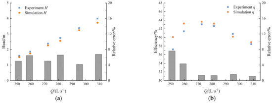 Figure 5 displays the comparison of hydraulic characteristics between simulation and experiment of the axial-flow PAT. Obviously, the performance curve of the simulation is in good consonance with the curve acquired by the experimental test. As the flow rate changes, the relative error between the experimental and the numerical simulation results is maintained in a relatively small fluctuation range. As shown in Figure 5a, the maximum head relative error is 6.8%. In Figure 5b, the maximum efficiency relative error of the numerical calculation and the model test is 7.63% at the small flow rate. Near the optimal flow rate, the efficiency relative error is 1.40%. In this paper, the reliability of numerical calculation results is verified.