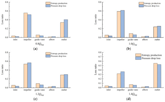 Comparison of pressure drop loss and entropy production of each component at different flow rates: (a) 0.8Qbep, (b) 1.0Qbep, (c) 1.2Qbep, and (d) 1.4Qbep.