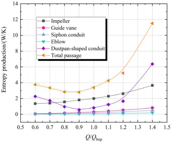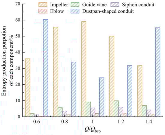 Figure 7 reflects the variation law of entropy production with flow rate of each component of the axial-flow PAT. As the flow rate goes up, the total entropy production of entire passage first decreases slightly and then increases significantly. At 0.9 Q/Qbep, the entropy production value of the entire passage is the smallest with the entropy production of 2.79 W/K. However, the entropy production of entire passage is the largest at 1.4 Q/Qbep, reaching 11.51 W/K. The entropy production of impeller, siphon conduit, elbow and guide vane all increase steadily as the flow rate goes up, and the entropy production of impeller domain increases the most. However, the entropy production value of dustpan-shaped conduit showed a trend of decreasing first and then increasing rapidly, indicating that the entropy production of dustpan-shaped conduit is extremely sensitive to change in flow rate. It can be seen from Figure 8 that the proportion of the entropy production in the impeller domain to the entire passage increases as the flow rate expands. At 1.0Qbep, the entropy production proportion of the impeller domain is the largest, reaching 59.11%. However, the entropy production proportion in the dustpan-shaped conduit shows the opposite trend. The entropy production proportions of siphon conduit, elbow and guide vane are maintained at a relatively low level. The proportion of entropy production also increases slightly along with the increasing of flow rate.