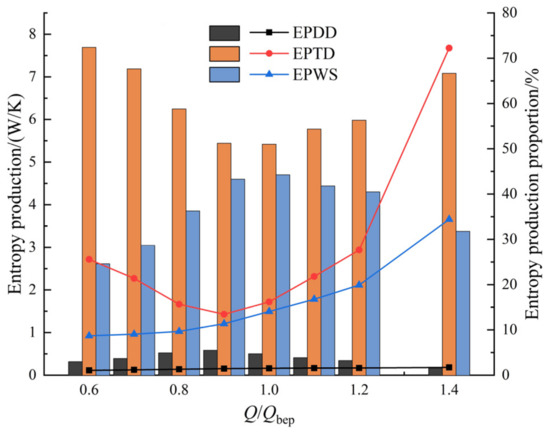 The proportion of EPDD in the total entropy production of entire passage is less than 5% at different flow rates. The proportion of EPTD is more than half of the total entropy production, and it occupies a dominant position in the entire passage. The EPWS of the entire passage shows a positive correlation with the flow rate. The proportion of EPTD is smallest at 1.0Qbep condition, but the proportion still reaches 51%. In contrast, the proportion of EPWS increases and then decreases along with the flow rate going up, with the maximum value of 44.3% at 1.0Qbep.