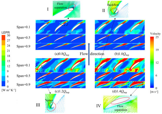 Distribution of LEPR at various impeller spans and local velocity vector diagrams: (I) Blade trailing edge at 0.8Qbep; (II) Blade leading edge at 1.4Qbep; (III) Blade leading edge at 1.2Qbep; (IV) Blade region at 1.4Qbep.